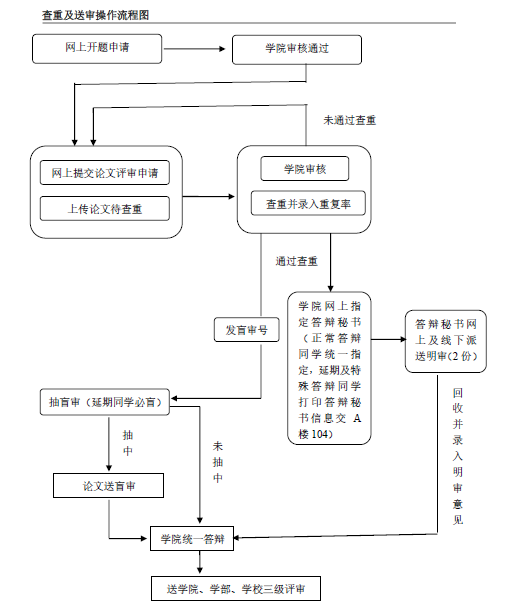 进入正式答辩之前,同学需要先通过重复率检查,并且完成抽盲审的过程,查重及送审的网上操作流程见下图。
