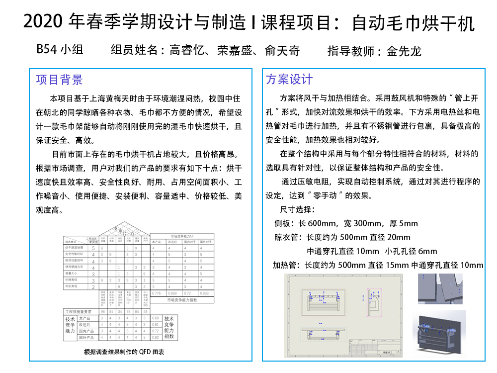 随着人们对生活质量的要求的不断提高,生活中的各个小细节的改进已经成为了不可忽视的重点。我们小组观察到校园生活中住在朝北的同学晾晒各种衣物、毛巾都不方便,同时身处上海的我们饱受黄梅天的“迫害”,在又湿又闷又热的环境下,十分希望各种“湿哒哒的物体”快速变干。由此,我们想到是否能够设计一款毛巾架能够自动将刚刚使用完的、湿哒哒的毛巾快速烘干,且保证安全、高效。
