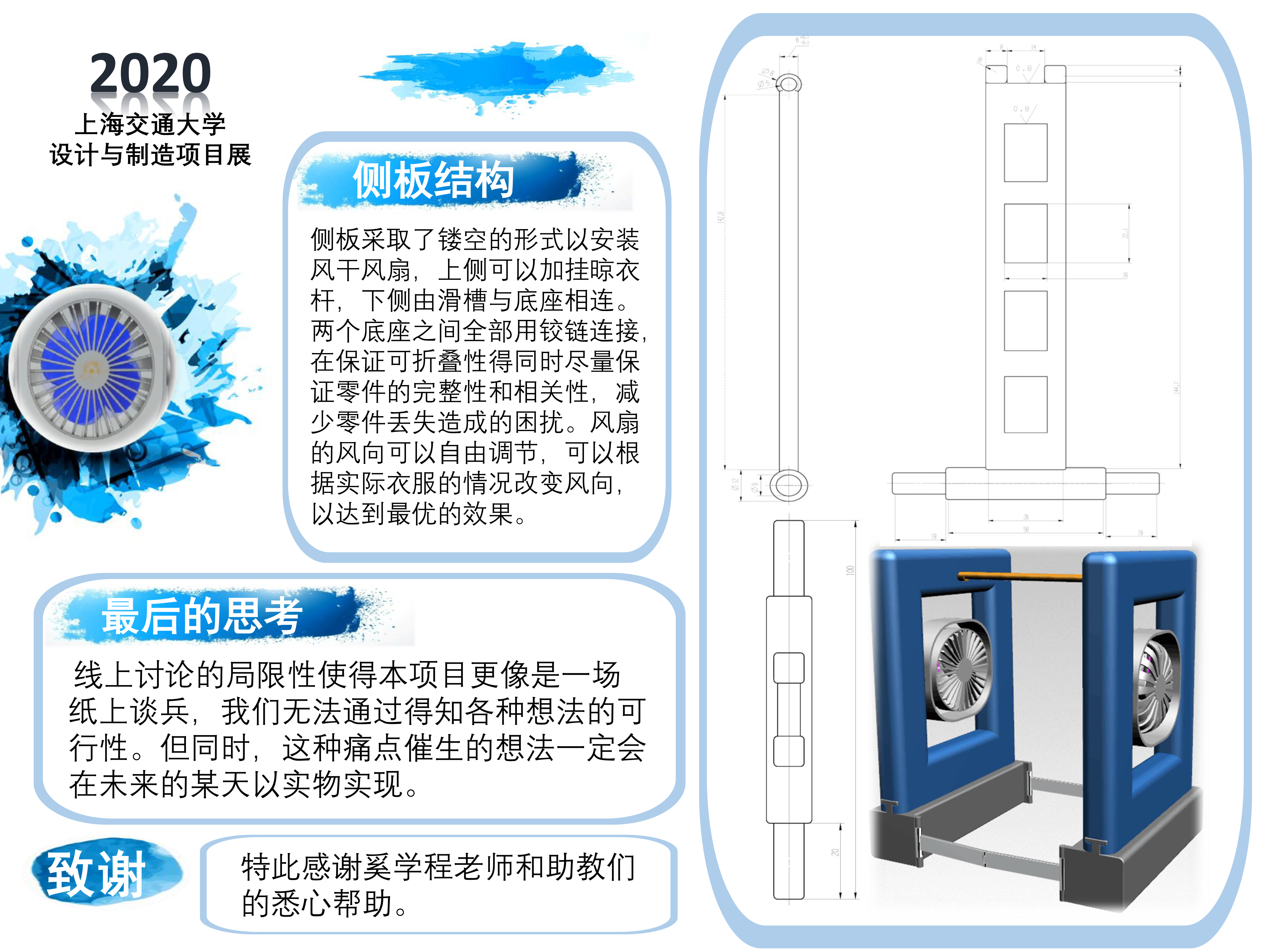 根据调查,有70%以上的人经常面临洗完衣服潮湿难干的问题。这种问题在较为潮湿的南方更为明显,针对这一问题,本项目从功能性、便携性出发,设计了基于风扇实现的快速衣物烘干机。这种机器旨在用相对较小的功率、较为轻便的体积和便捷的折叠性解决生活中的干衣难题。机器采取侧面风干的方式使衣物脱水,侧板和底板都设计为可拆卸结构,方便日常使用。