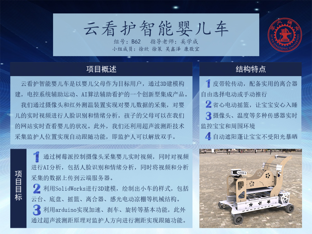 云看护智能婴儿车是以0~2岁婴儿的妈妈作为目标用户,通过3D建模构建,电控系统辅助运动、AI算法辅助看护的一个创新型集成产品。我们通过摄像头和红外测温装置实现对婴儿数据的采集,对婴儿的实时视频进行人脸识别和情绪分析,最后将数据信息汇总渲染到网页上,孩子的父母可以实时查看婴儿的状况。此外,我们还侧泳超声波测距技术,通过对监护人信号的采集实现跟随功能,即监护人可以解放双手,避免了用手推或者拉婴儿车。