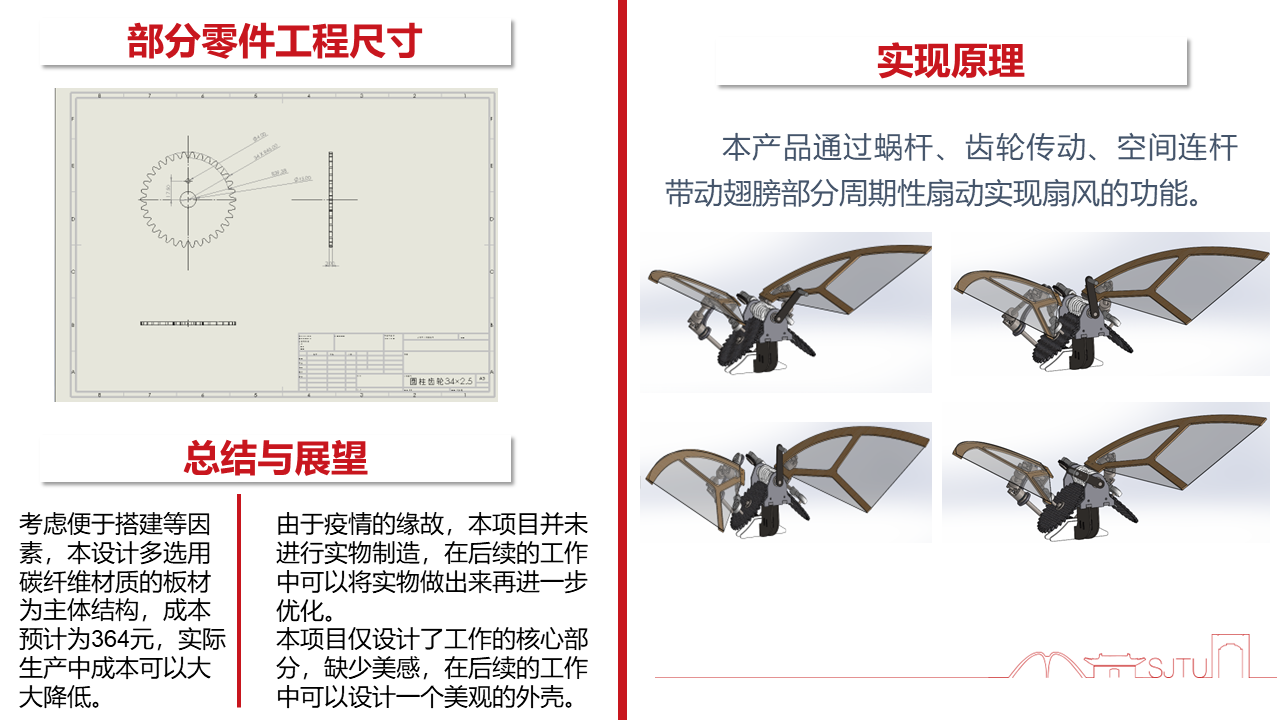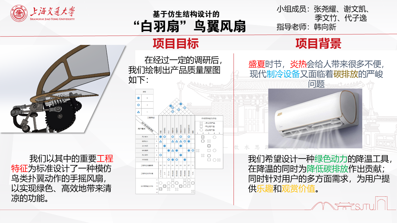 要实现绿色节能的目标,我们希望动力来源是手动;要使得风力大小较大,我们希望通过机械结构设计省力的工作方式,从而花费较小的力气即可产出较大的风;要控制整个产品的噪音大小,我们希望机械结构足够稳固,减少结构的震动、摩擦、形变,尽量保证整体的刚度,减小挠度。此外,我们希望设计出的产品具有一定观赏性,从而更加符合市场的需求。