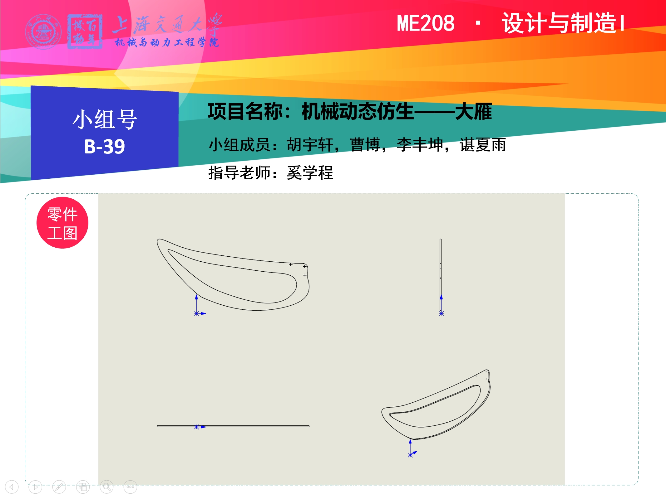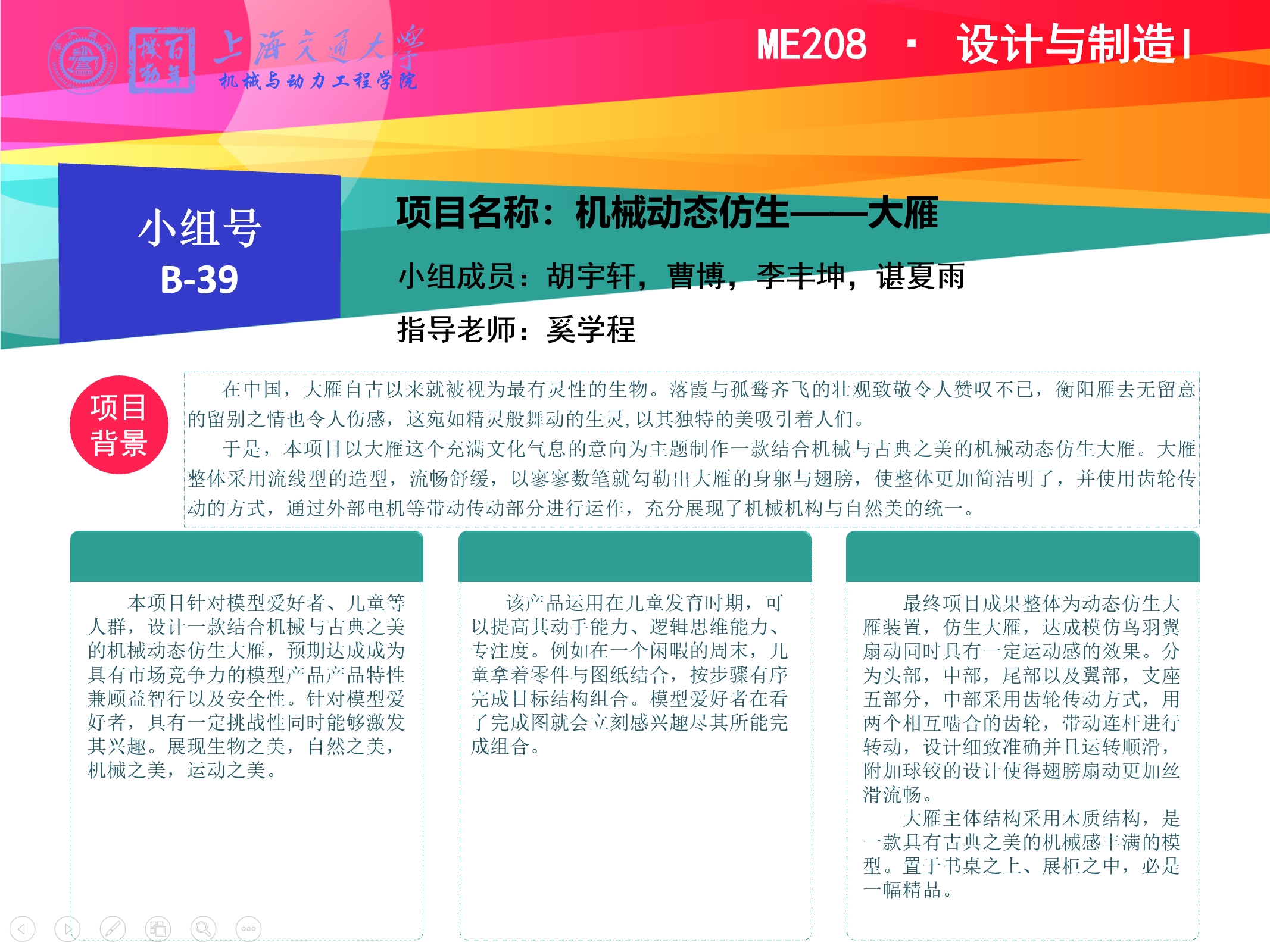 最终项目成果整体为动态仿生大雁装置,仿生大雁,达成模仿鸟羽翼扇动同时具有一定运动感的效果。分为头部,中部,尾部以及翼部,支座五部分,中部采用齿轮传动方式,用两个相互啮合的齿轮,带动连杆进行转动,设计细致准确并且运转顺滑,附加球铰的设计使得翅膀扇动更加丝滑流畅。大雁主体结构采用木质结构,是一款具有古典之美的机械感丰满的模型。置于书桌之上、展柜之中,必是一幅精品。
