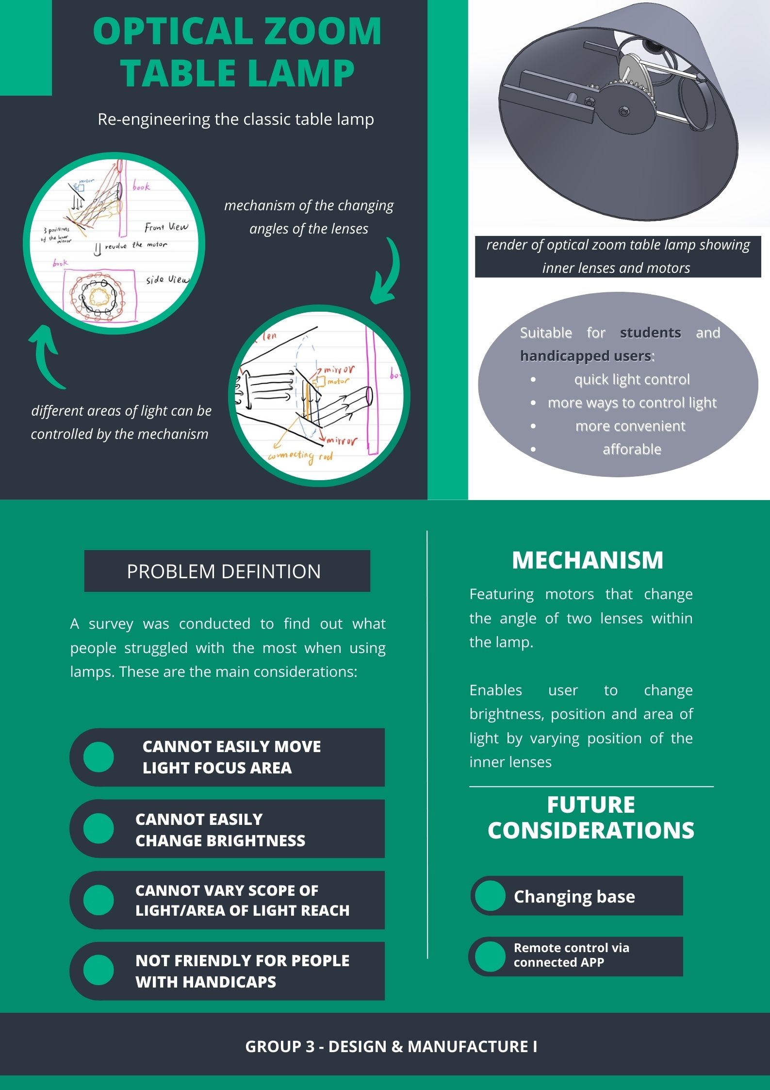 This table lamp is mainly composed of mechanical part and electronic part. The mechanical parts are mainly lenses, gears and guides. Lenses are used to concentrate and reflect light. Through the linkage between the three, we can change the size, direction, and position of the light. The electronic part is mainly used to control the mechanical part. We plan to use an APP to control the light, so that the user can use it more conveniently, whether he or she is studying or getting up at night to turn on the light.