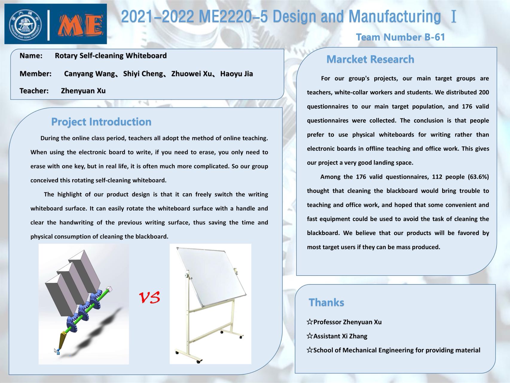 The main aim of our project is to build a more intelligent and safe campus. And it is vital to prevent students and teachers from being harmed by the dust. We hope that students in the future will not go through the experience of being choked by toxic dust and cleaning white board several times a class. The aim of “self- cleaning white board” is not only to set students and teachers free from the load of cleaning the white board, but also to improve the quality of every lecture through every single detail. With the help of “self- cleaning white board”, teachers may simply twist the handle instead of stopping the class and spending one or more minutes on cleaning the white board. All of the details help to improve the continuity and integrality of the teaching content. There is no doubt that “self-rotating white board” will definitely make a difference on the existing teaching system. The application of computer and other electronic equipment do help increase the efficiency and provide a new way of communication, but we hope that the “self-rotating white board” will offer a more sustainable and traditional choice.