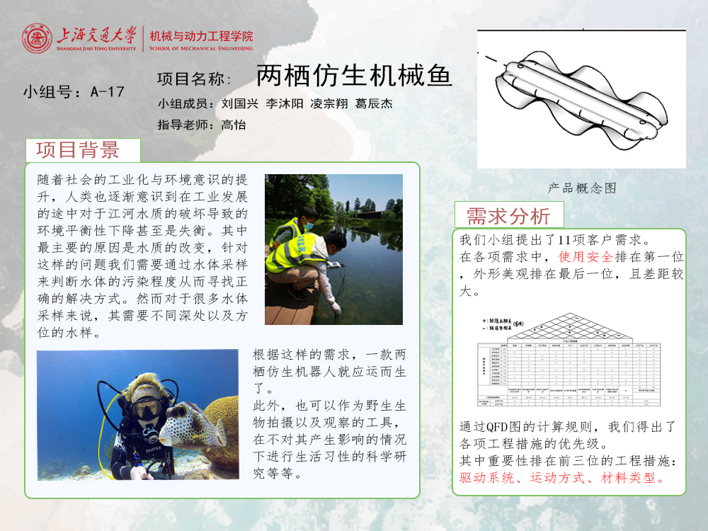 最终我们初步找到了解决方案,基本满足了我们的用户需求。能够实现采用陆上遥控的方式进行水下的检测操作,遥控距离需求与信号传输强度有关,基于现有的条件,我们需要购买好的信号传输装置,另外关于安全性等需求也能得满足。后期我们希望能够基于装置体积的大小,尽可能多的增加其功能,安装定位系统等等,优化用户操作方式,比如一键上浮,自动悬停键等等。
