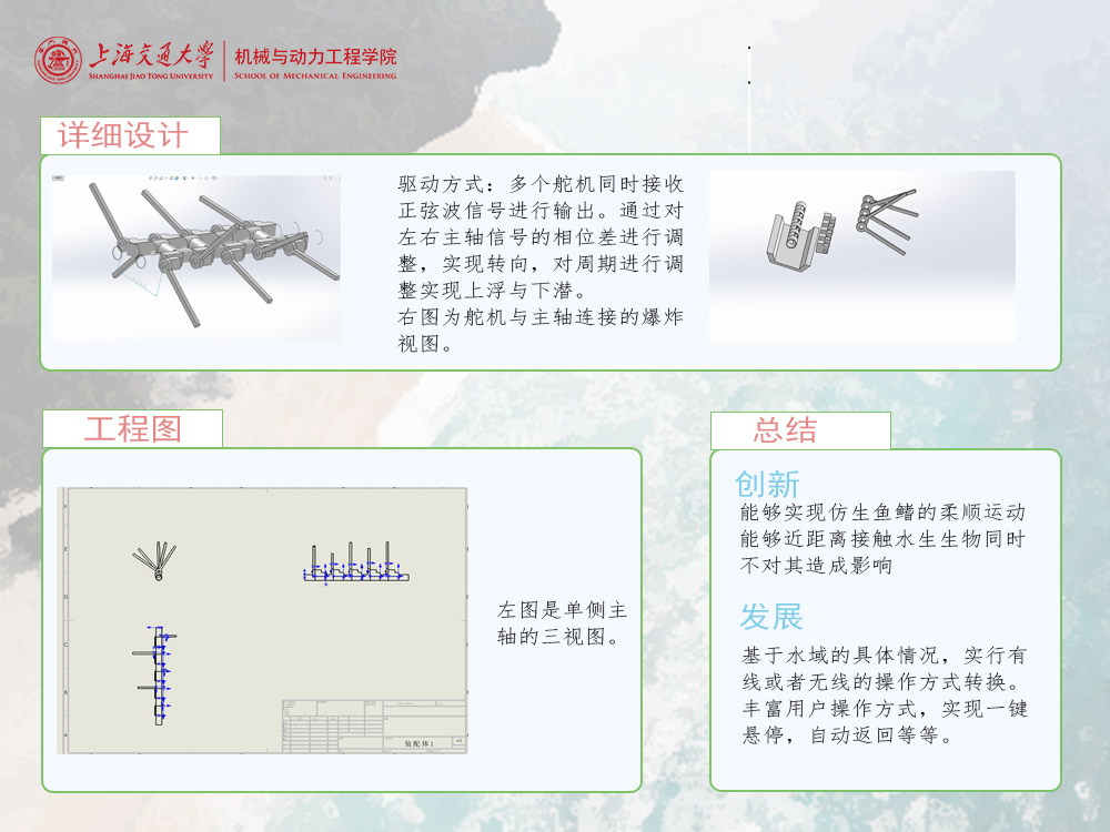 设计一个以刺魟为原型的水陆两用仿生机器鱼,期望这个机器人能够实现在水中平稳快速地运动,并且能够实现上浮下潜悬停转弯等操作,同时也能在陆地上进行简单的平面运动。同时在实际生活中,这台仿生鱼可以实现辅助水面情况探测以及轻量物资运输等功能。