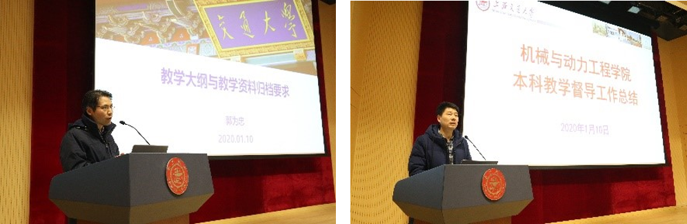 学院课程思政工作组组长郭为忠介绍了工程教育认证标准下新版课程大纲编写要点和课程教学资料归档要求,以《设计与制造II》为例详细解读了课程考核合理性审核表填写方法及课程目标达成度的计算方法,介绍了基于专业认证要求的试卷归档标准。学院督导组组长杨培中从督导听课情况、试卷抽查及课程评估三个方面对本学期本科教学督导工作进行了总结,并简要介绍了督导组新一年工作计划。
