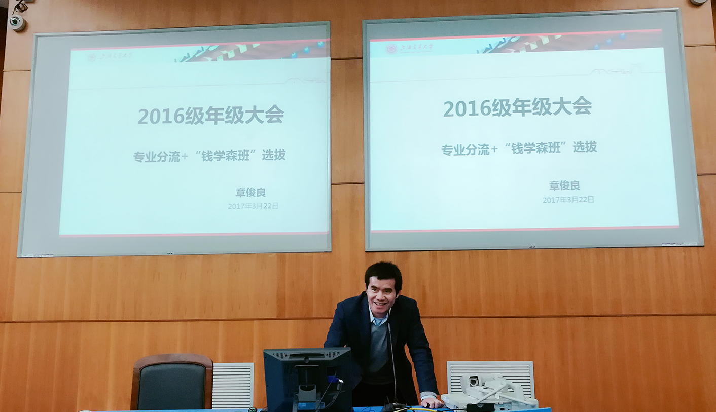 2017年3月22日,威尼斯9499登录入口2016级本科生专业分流、“钱学森班”选拔介绍会在上院500顺利召开。学院副院长章俊良教授、本科教务办主任吴艳琼老师、年级思政王国锋、陈龙老师、年级教务袁霞老师以及2016级本科生参加了本次会议。