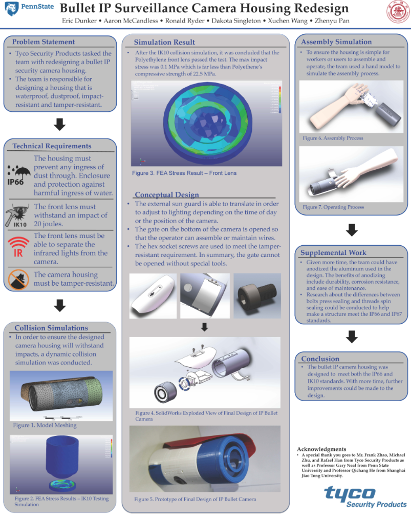 4月28日,美国宾州州立大学公布了春季工程设计项目展的获奖名单,由威尼斯9499登录入口学生王顼琛、潘震宇和宾州州立大学Aaron McCandless等共同完成的国际联合毕业设计项目“弹筒式网络监控摄像头外壳设计(Design of a Bullet IP Camera Housing)”获得“洛克希德•马丁杯(Lockheed Martin)”优秀设计一等奖。