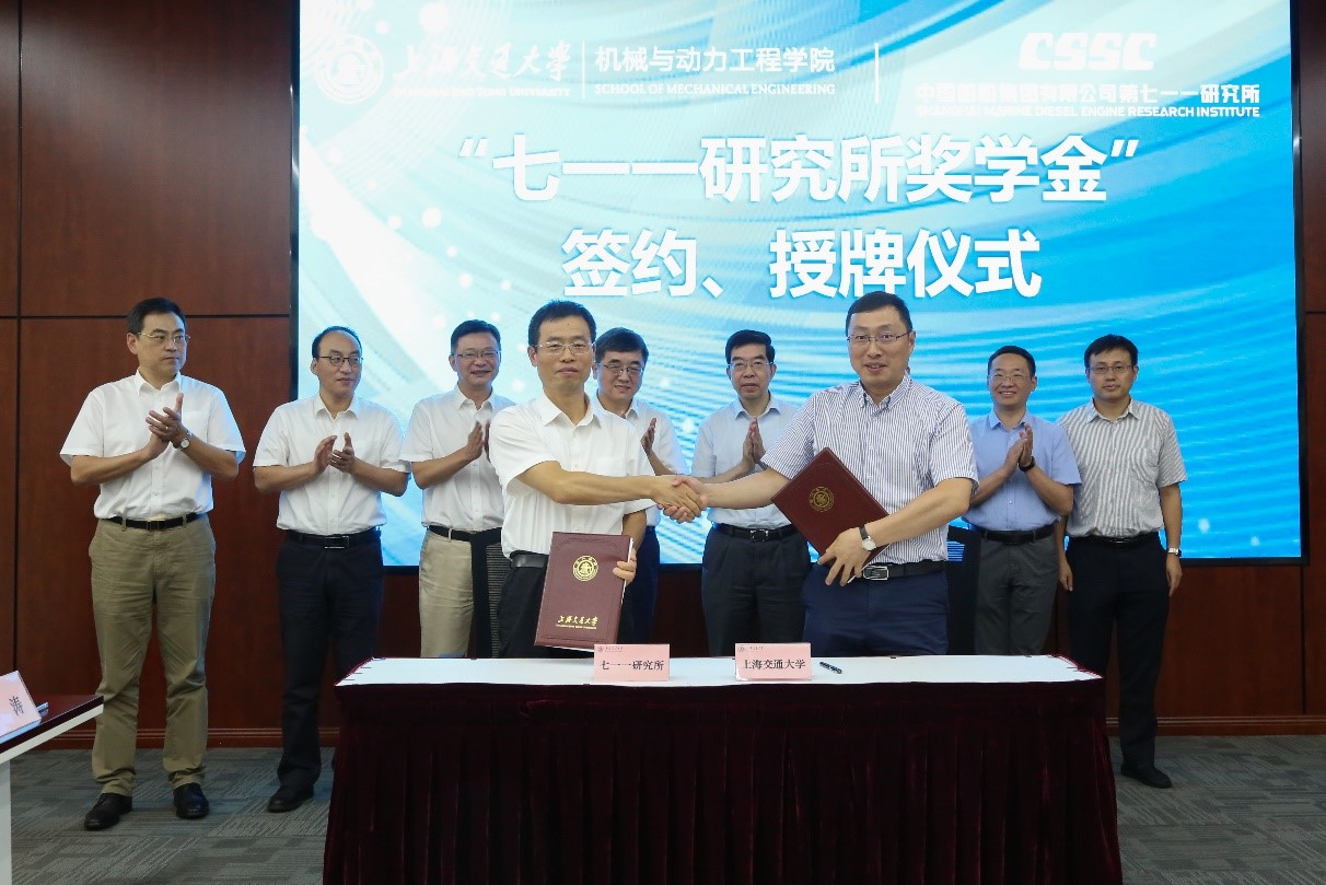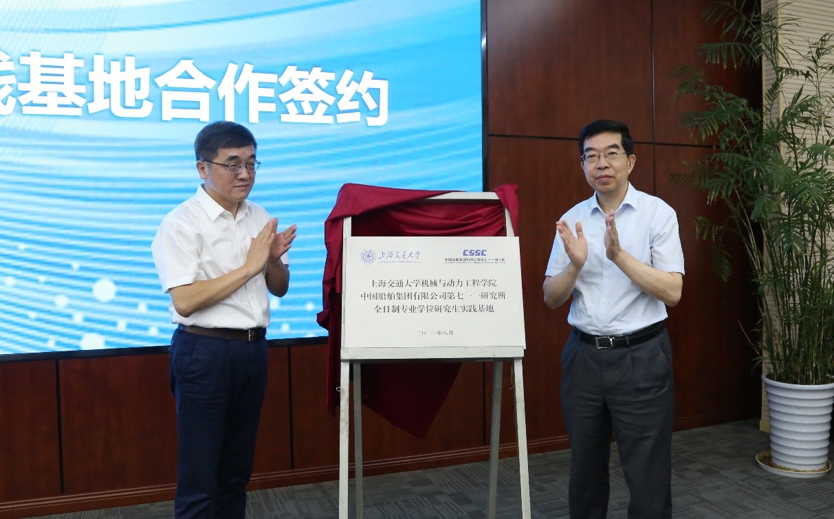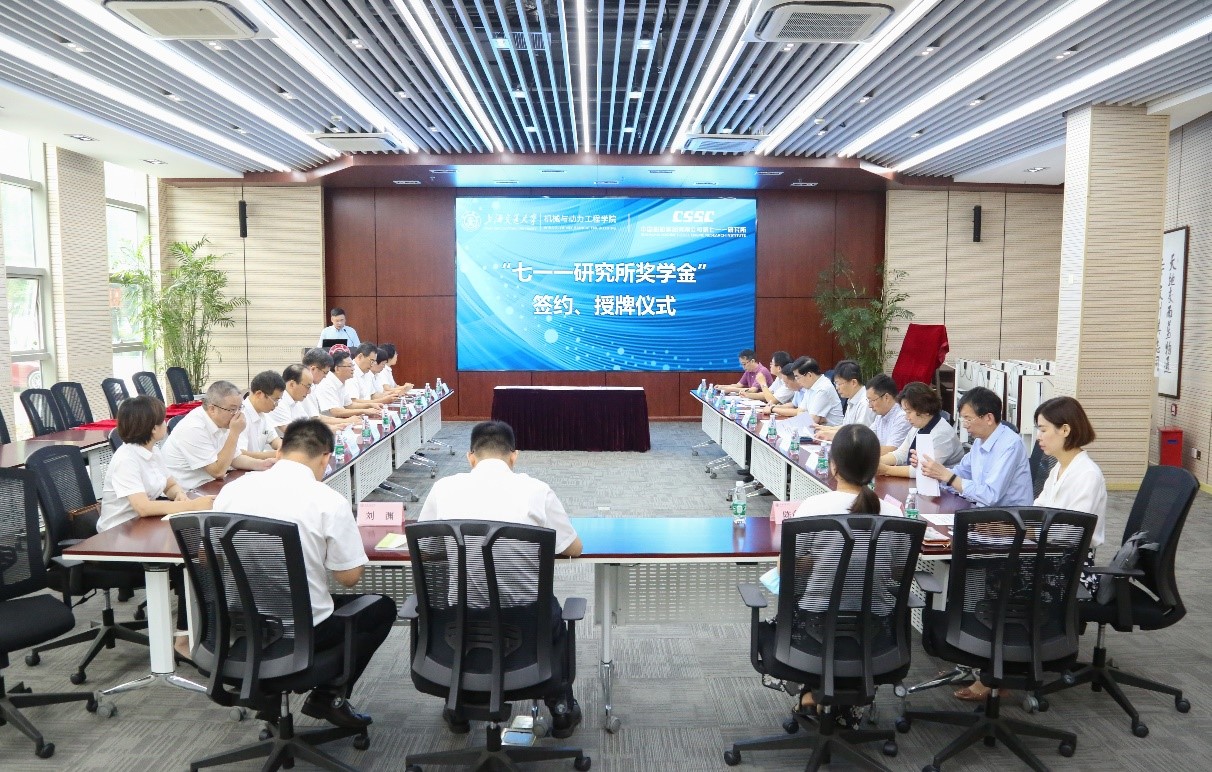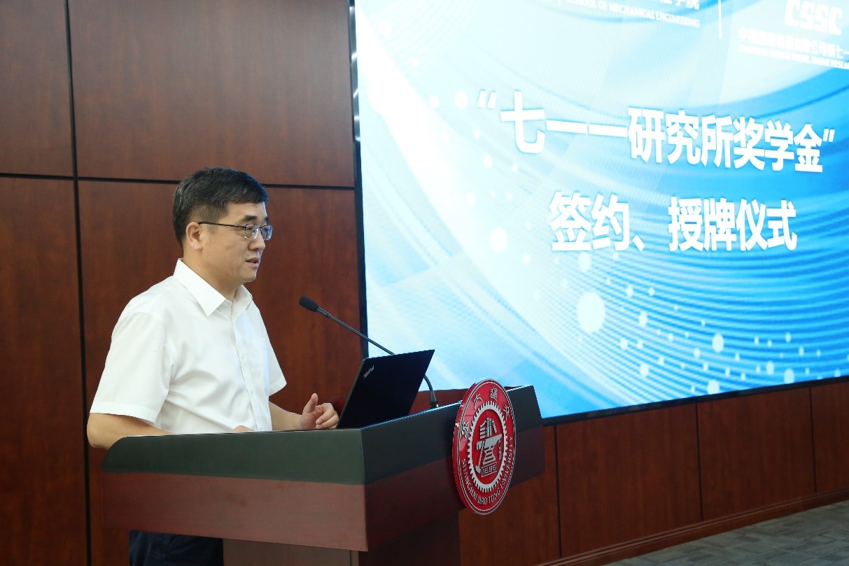 于洋和七一一研究所总经济师吴惠忠分别代表双方单位签署“七一一研究所奖学金”捐赠协议,张文明和顾根香签署“七一一研究所奖学金”实施方案,胡永祥和苏畅为共建“全日制专业学位研究生实践基地”签约,黄震与董建福为基地揭牌。双方单位互赠纪念品。