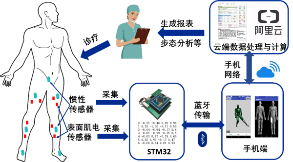 目前国内市场对运动康复的需求同康复资源之间的矛盾日益突出,主要集中于患者对医院高端仪器设备以及高端康复师的依赖,传统康复学科亟需向数字化、智能化和远程化转型。项目采用SENSOR+IOT+AI技术,利用传感器获取人体惯性参数与肌电信息,通过下肢四元数运动学建模实现人体姿态还原,结合人体关节参数自辨识与广义互补滤波算法实现误差矫正与标定,并搭建以LSTM神经网络为基础的评价系统,利用手机端作为交互界面,同时建立云端管理与评价界面,实现一键生成步态分析报告,辅助医生进行远程诊断。