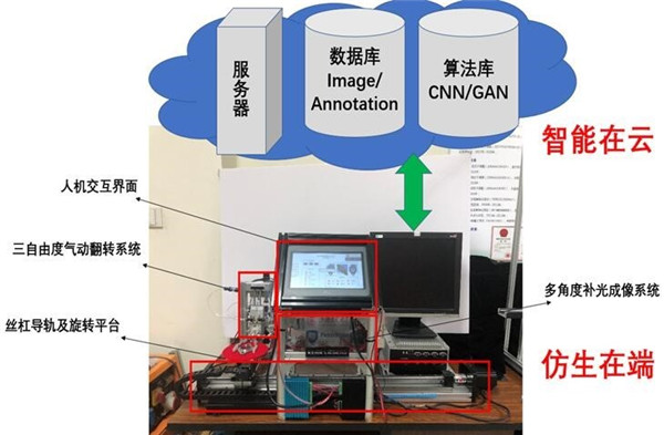 针对空间复杂型面上微细瑕疵检测难题,项目提出了“传感-操作-决策一体化协同仿生”检测法,从方面视角选择、观测方法、识别经验3方面模拟熟练产业工人行为,开发眼手协同自动化系统,实现高效法兰表面微细瑕疵检测与分类溯源。项目对接赞助企业日产50万件法兰制造生产线,设计了自动上下料、调姿、成像的法兰表面质量检测专机,部署了嵌入式实时算法,开发了人机友好操作界面,建立了法兰表面瑕疵检测本地数据库和算法库、云端接入接口,进行智能化检测与自动化分类,为工件非平面表面检测难题提供了通用解决方法。