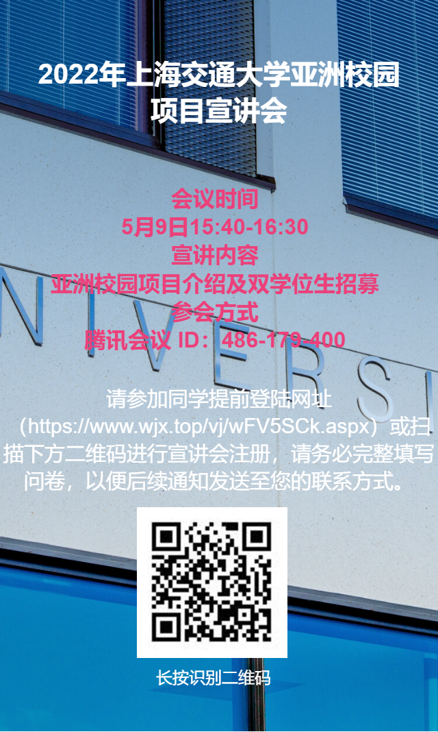 5月9日(周一)学校研究生院将举办“2022年威尼斯9499登录入口亚洲校园项目线上宣讲会”,届时将为大家详细讲解亚洲校园项目、双学位生招募等内容。同时,将邀请往届学员进行学习体验分享。