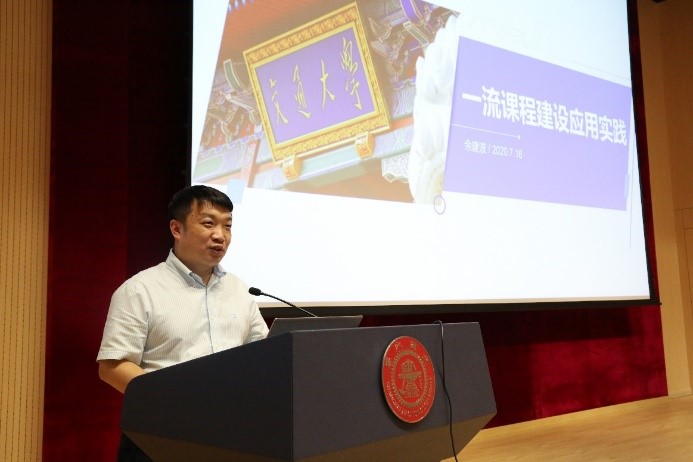 余建波从“为什么建一流课程”、“如何建设一流课程”以及“一流课程申报政策”三方面详细介绍了一流课程建设应用及申报指南。他通过引出“产出导向”OBE教学设计理念,强调了线上线下模式有机结合的重要性,就线上一流课程、线下一流课程、线上线下混合式一流课程、社会实践一流课程、虚拟仿真金课五类课程具体解读了课程建设特点、重点及要点,详细分析了课程申报观测点、评分规则等,为学院教师未来申报一流课程及建设提供指导意见。