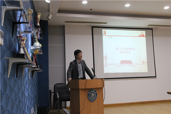 学院党委书记、院长杜朝辉以“不忘初心,坚定信念,努力奋斗”为主题,为毕业生上了一堂生动的党课。他以切身经历与感悟让同学们体会到中华民族在中国共产党的领导下迎来了从站起来、富起来再到强起来的伟大飞跃。他列举百岁教授、上海交大原校长范绪箕,中国工程院院士、中国核潜艇之父黄旭华以及林忠钦校长等诸多榜样的故事,勉励毕业生党员学会认识世界、认识中国、认识自己;要志存高远,脚踏实地,努力实践;他用习近平总书记的话寄语青年一代“有理想、有本领、有担当”,坚守新时代大学生的责任与使命,做新时代的优秀党员,为国家建设做出自己的贡献。
