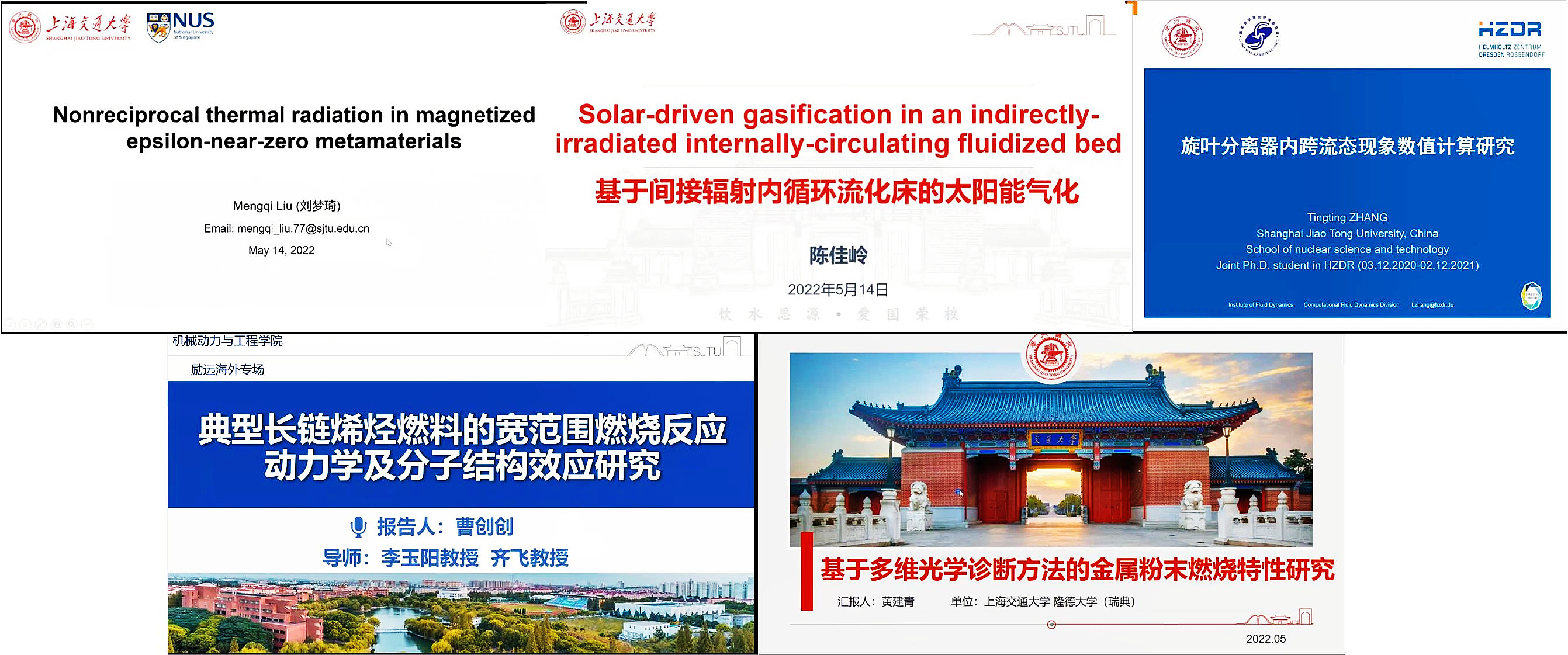 威尼斯9499登录入口制冷与低温工程研究所博士研究生陈佳岭、航空动力研究所博士研究生曹创创、工程热物理研究所博士研究生刘梦琦、核科学与工程学院博士研究生张婷婷、叶轮机械研究所博士研究生黄建青,分别围绕“基于间接辐射内循环流化床的太阳能气化技术”、“典型长链烯烃燃料的宽范围燃烧反应动力学及分子结构效应研究”、“近零磁化超材料中的非互易热辐射技术”、“叶片式气液分离器形态自适应混合模型的验证技术”、“基于多维光学诊断方法的金属粉末燃烧特性研究”进行了分享。
