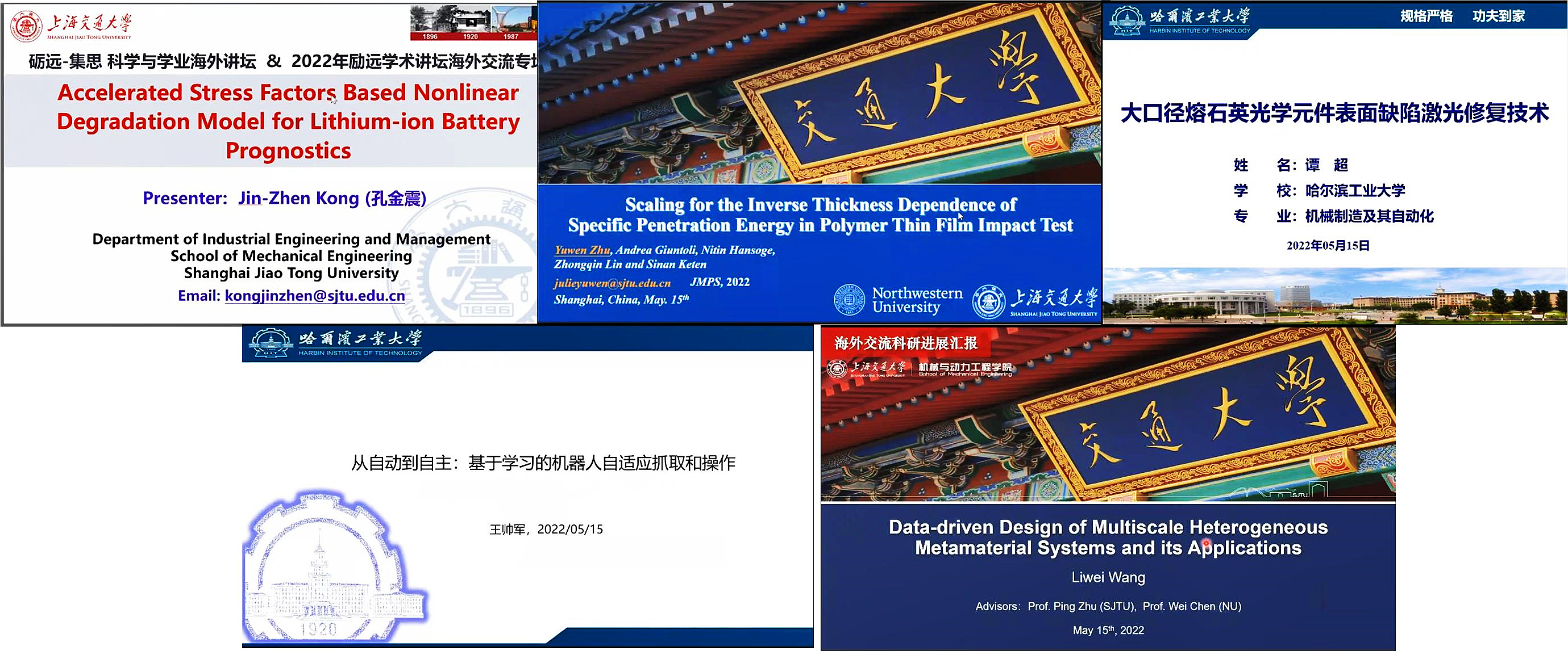 哈尔滨工业大学博士研究生王帅军、谭超,威尼斯9499登录入口薄板结构制造研究所博士研究生朱宇文、智能汽车研究所博士研究生王力为、工业工程与管理系博士研究生孔金震,分别围绕“机器人从自动到自主的自适应抓取和操作技术”、“高功率激光装置中熔石英光学元件表面缺陷激光修复技术研究进展”、“在聚合物薄膜冲击试验中、比穿透能与厚度成反比关系的标度研究”、“数据驱动的多尺度非均质超材料系统设计及其应用研究”、“基于加速应力因子的锂离子电池非线性退化预测模型的研究”进行了分享。