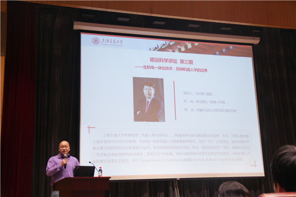 朱向阳的演讲主题是生机电一体化技术:延伸机器人学的边界。他以一组主题为“机器人:20世纪的伟大科技成就”的动画开启他的讲述,和同学们普及了机器人在航空航天、食品、工业、人工智能、自动化、生物医疗等方面的应用。他展示了活体脑控制机器人、人工控制老鼠运动、意识控制蟑螂运动三个先进神经控制技术的视频,演示了高端的生机电技术。通过机械结构和意识识别,以假肢为代表的生机电技术取得了很大的进步,但同时教授也讲授了假肢的技术难度,以神经通道构建和机构设计为甚,让大家看到了生机电技术巨大的可能性和希望与困难并存的前景。