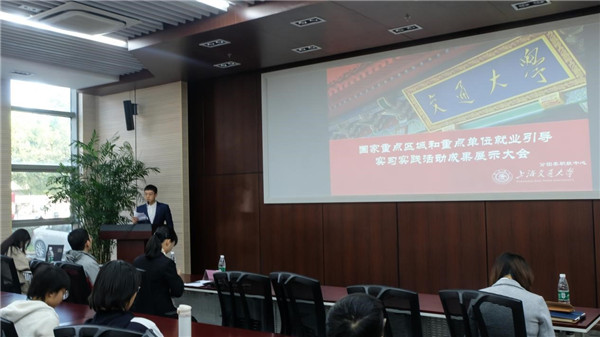 首先由阮海涛为本次大会致辞。他解释了国家重点区域和单位就业引导实习实践活动的内容和初衷,希望同学们能够通过这次实践活动对一些偏远地区和企业有一个全面并且客观的认识,鼓励交大学子积极参与实践活动,投身国家制造,为祖国腾飞贡献出自己的力量。