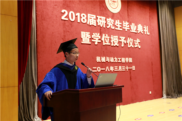 上海市优秀毕业生史天蛟代表毕业生发言。他围绕“机遇”二字,讲述了自己在交大成长的心得体会。他感谢学校和学院为同学们提供的优良学习环境、有力的科研支持以及优秀的导师指导。他以自身为例,讲述了事业选择的机遇,在学院的就业引导下,同学们有机会走进基层、了解企业的发展现状,把握国家发展的机遇,最终他选择到四川中国核动力研究设计院去实现科技报国的梦想,将个人发展融入到国防事业的建设中去。