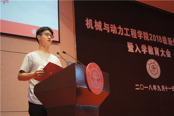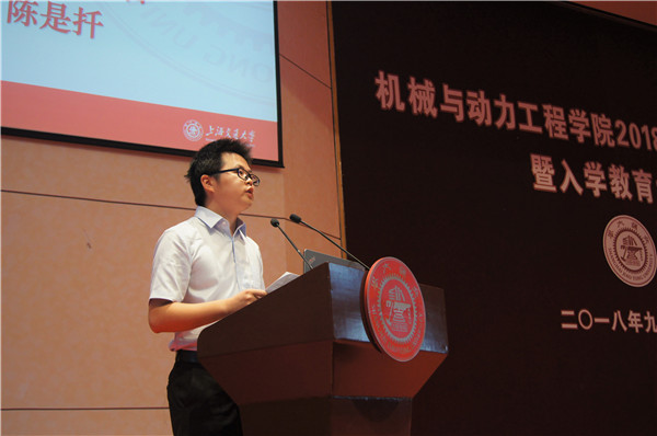 2016级博士生陈是扦代表老生发言。作为15篇SCI论文作者、博士研究生国家奖学金获得者、机动学院首届学术之星,他向全体新生分享了自己一路走来的心路历程和科研经验。他认为,尽快调整好心态,适应快节奏的科研生活是每位同学必须解决的难题。他鼓励学弟学妹们在科研中要有凌云之志,更要不矜不伐,谦虚好学;要有严谨的科学态度,慎重则必成,轻发则多败;要有天生我材必有用的自信和初生牛犊不怕虎的精神,挫而不败,战胜困难。