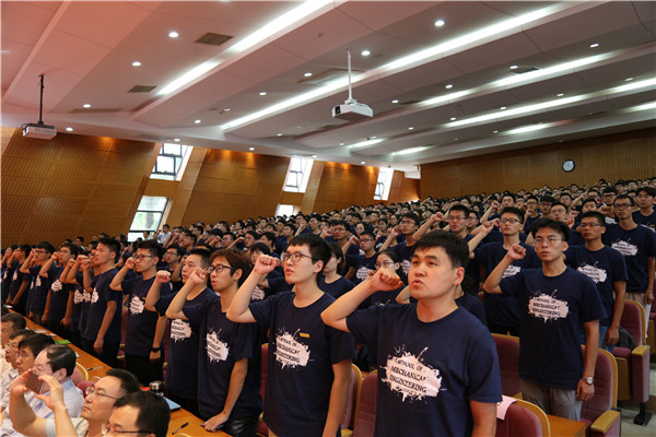 随后,全体机动新生起立庄严宣誓,以崭新的身份,开启了人生中的又一段旅程。“我将谨记‘饮水思源、爱国荣校’之校训,诚信为本、精勤为学、脚踏实地、追求卓越,树立学术理想、坚守行业情怀,我制造强国实业兴邦而奋斗终身。”