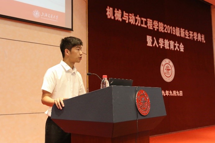 2019级硕博连读生张开淦代表全体新生发言。他表示,新生同学需要尽快适应身份的转变,有能力、有义务、有意识地多一份责任、多一份毅力。他号召同学们为强国兴邦铸就重器,为追寻真理孜孜不倦,为经世济民殚精竭虑。