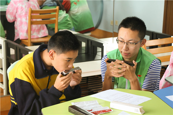 下午一点左右,志愿者们抵达启智学校,稍做准备后,就看到一群孩子又蹦又跳地进了阶梯教室。志愿者们走到孩子中间,十分随和亲切地同他们交流,并开始了一对一的口琴教学。孩子们对口琴、对音乐都表现出了浓厚的兴趣。他们点点乐谱,又看看手里的口琴,再用力的吹气——美妙的音符升起了孩子们灿烂的笑脸。志愿者们积极耐心地与孩子们沟通,解决吹奏上的一个个小难题。教室里蔓延着阵阵乐声与欢笑声。