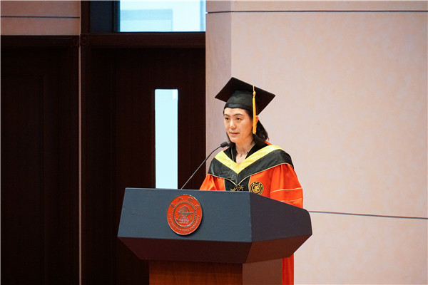 校友代表林芃回顾了自己的交大生涯,以自身经历劝导同学们毕业以后不忘初心、坚持不懈。他认为,天下没有一帆风顺的道路,无论是在国内外继续深造或是就业工作,都应该不惧挑战,迎难而上;虽然难免会信念动摇,但唯有不枉青春砥砺前行,方能不负韶华。