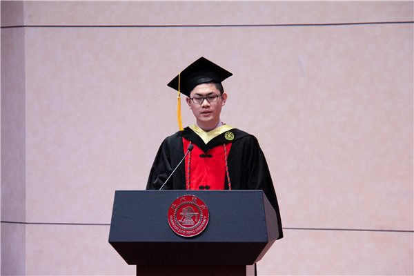 研究生代表陈是扦表达了对交大的感恩和自己回乡奉献的愿望。结合自己的成功经历,他感恩交大带给他的严谨求真的科研态度。本科生代表徐文彬叙述了四年来自己人生态度的转变,建议同学们认定目标就必须竭尽全力,不应安于现状,要勇于突破自己的舒适圈。