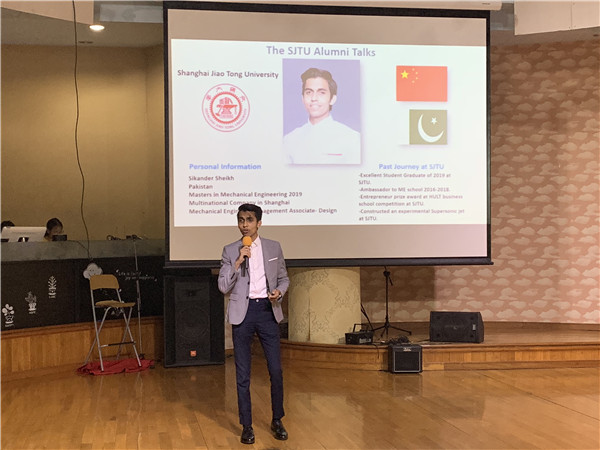本次迎新活动还邀请到了已经毕业的优秀留学生Sikandar进行经验分享。Sikandar从自己在交大生活的经历谈起,讲述了自己作为一名留学生如何顺利取得学位,并留在上海工作的历程,并总结了自己的经验。分享完毕后,Sikandar还与在场的同学们进行交流,并就“一名外国人在中国工作的过程中需要注意哪些方面”等问题回答了同学们的提问。