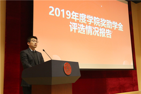 熊振华做2019年度奖助学金评选报告,介绍了2019年度威尼斯9499登录入口奖助学金评选工作原则和流程,各级、各类奖助学金评选情况,其中2019年度威尼斯官网共设立社会捐赠类奖学金22项,受奖助超过294人次,总资助额超过1425000元。最后他向全体设奖方表示感谢,向获奖学生表示祝贺,勉励同学饮水思源,知恩图报,再创辉煌。