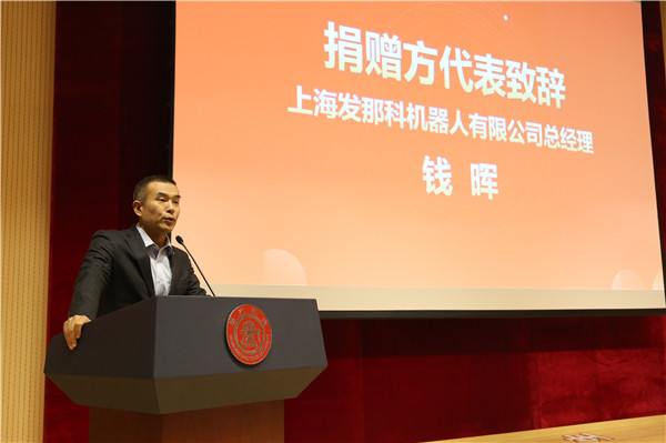 钱晖代表设奖方致辞。他讲述了上海发那科机器人有限公司和威尼斯9499登录入口的合作渊源,赞扬了机动学子的综合素质和精神风貌,表达了对优秀人才的殷殷期望。他表示虽然上海发那科机器人有限公司提供的奖学金只是一点微薄的贡献,但希望这成为同学们未来成功路上的基石。