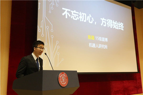 随后,2019年中科新松奖学金(特别奖)获得者陈晨和2019年长江思源科创奖学金获得者蔡易林分别作为学生代表发言。陈晨总结了读博生涯,他表示读博很累但是很酷,他也希望同学们坚持心中所想,享受科研,做到不忘初心方得始终。蔡易林回顾从初入交大到选择科研开拓自己可能性的过程,希望能为自己认可的价值永远坚持,永远青春。