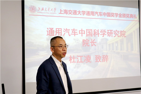 随后,齐飞宣读了获奖学生名单,并和杜江凌、MARIA MORA VINUUEZA共同为获奖学生颁奖。获奖学生代表颜诗旋和李凡做了发言。他们分别介绍了各自在产学研合作项目中的收获以及在国外访学的经历,感谢通用汽车中国对他们的认可和鼓励。