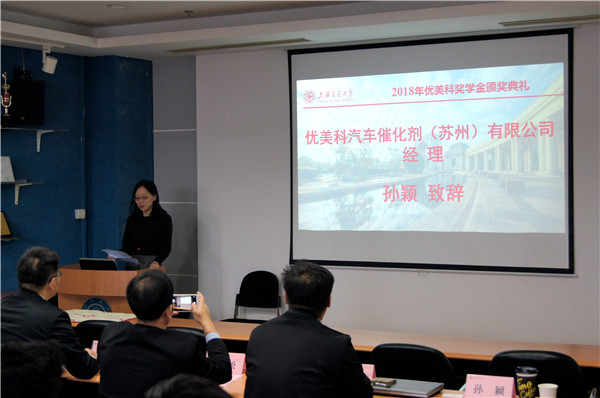 随后,朱文松宣读了获奖学生名单,并和林赫、朱磊共同为获奖学生颁奖。获奖学生代表李凡做了发言。他介绍了自己的研究进展,并对优美科公司表示感谢。他认为奖学金的设立不只是物质上的奖励,更是精神上的肯定,自己会再接再厉,取得更大的成就。 优美科汽车催化剂公司是全球三大汽车催化剂生产商之一。公司与世界知名的发动机和整车生产企业相互合作,开发和设计出高效经济的汽车催化剂产品,提供有效的汽车尾气排放解决方案,从而帮助客户达到增强动力、降低油耗、减少排放以及优化系统等目标。