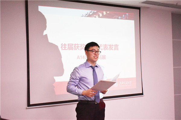 来自A1402093班的博士生高展代表往届获奖学生发言。高展介绍了自己过去一年以来取得的成绩,对丰田纺织表达了诚挚谢意,同时对今年获奖同学表示祝贺。