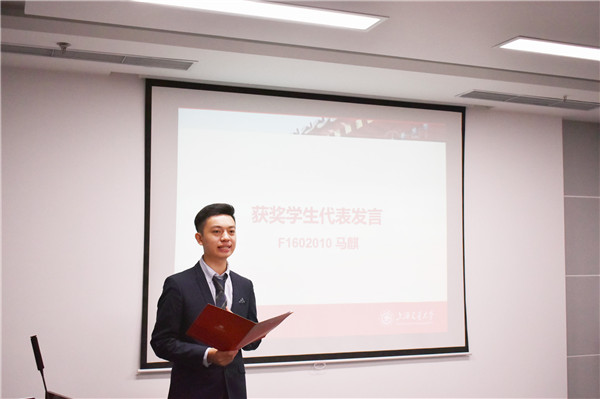 来自F1602010班的本科生马麒代表本届获奖学生发言。他表示获得丰田纺织奖学金是对自己综合表现的肯定,今后将不忘初心,更加努力,争取取得更大成绩。