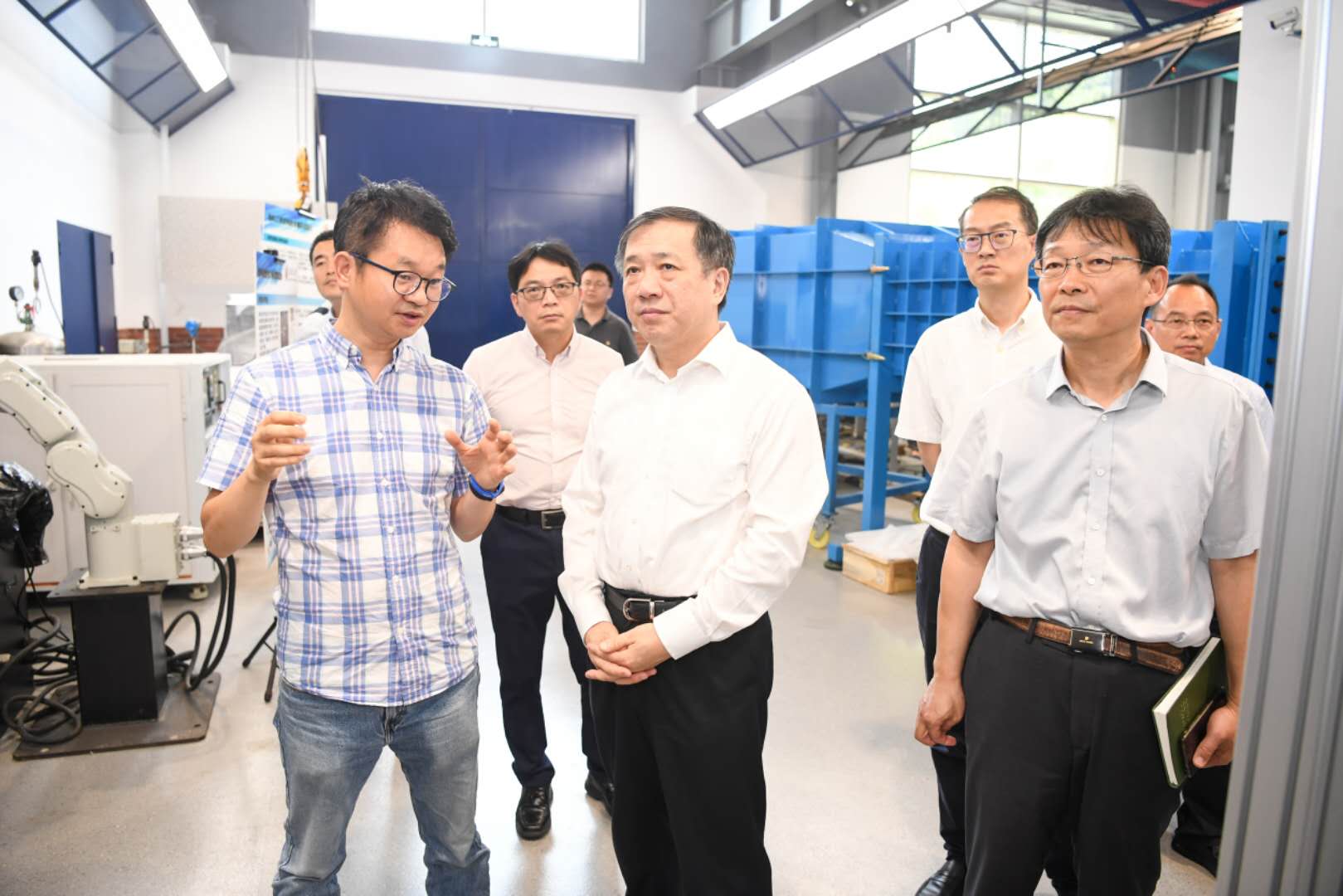杨振斌一行还参观了动力机械与工程教育部重点实验室、薄板结构制造研究所实验室,了解实验室复工复产情况,并与学生亲切交流。