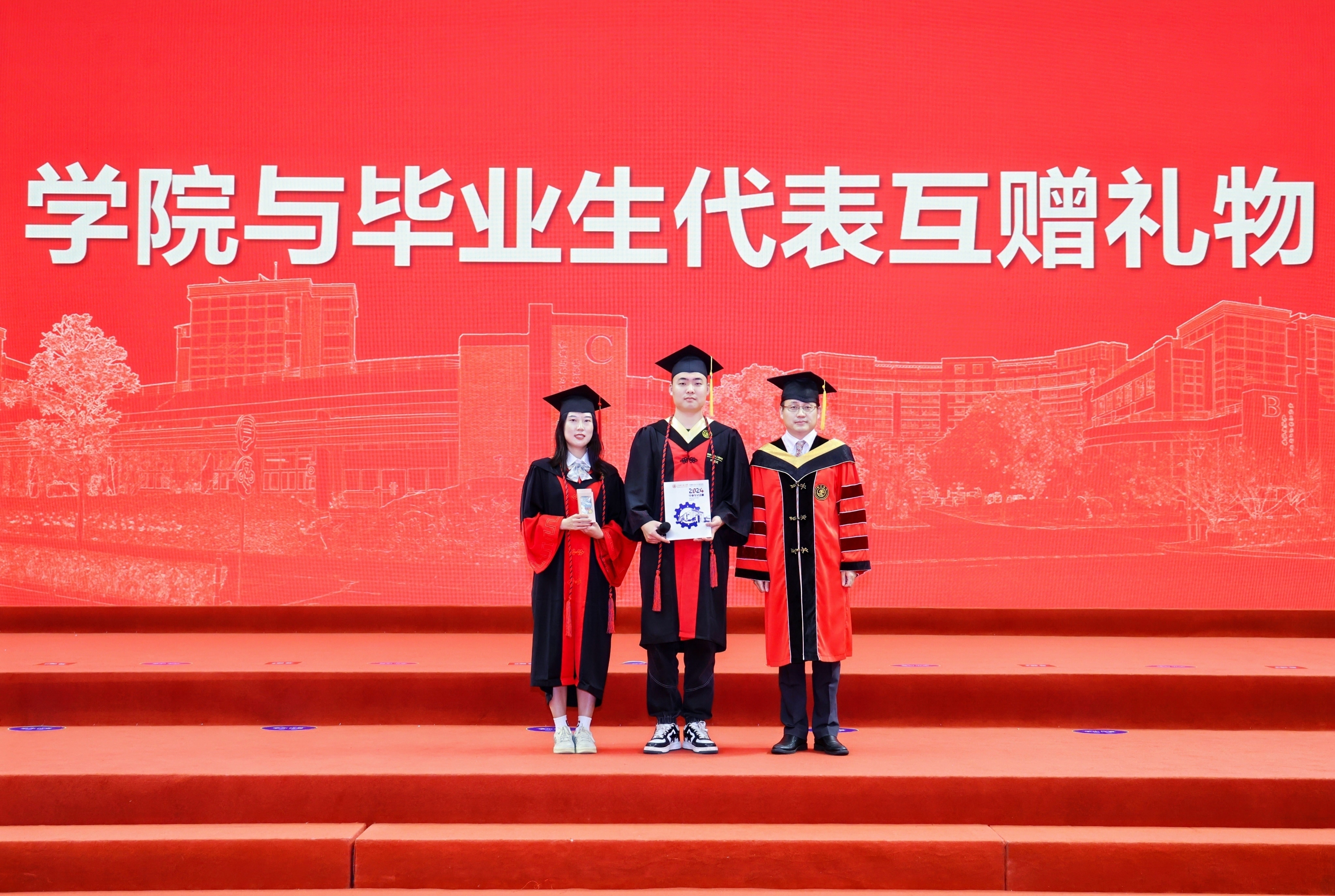 本届毕业生们为学院捐赠了20000余元,祝愿学院的明天更加辉煌。胡永祥代表学院接受赠礼,并向毕业生赠送纪念册、学位服等。