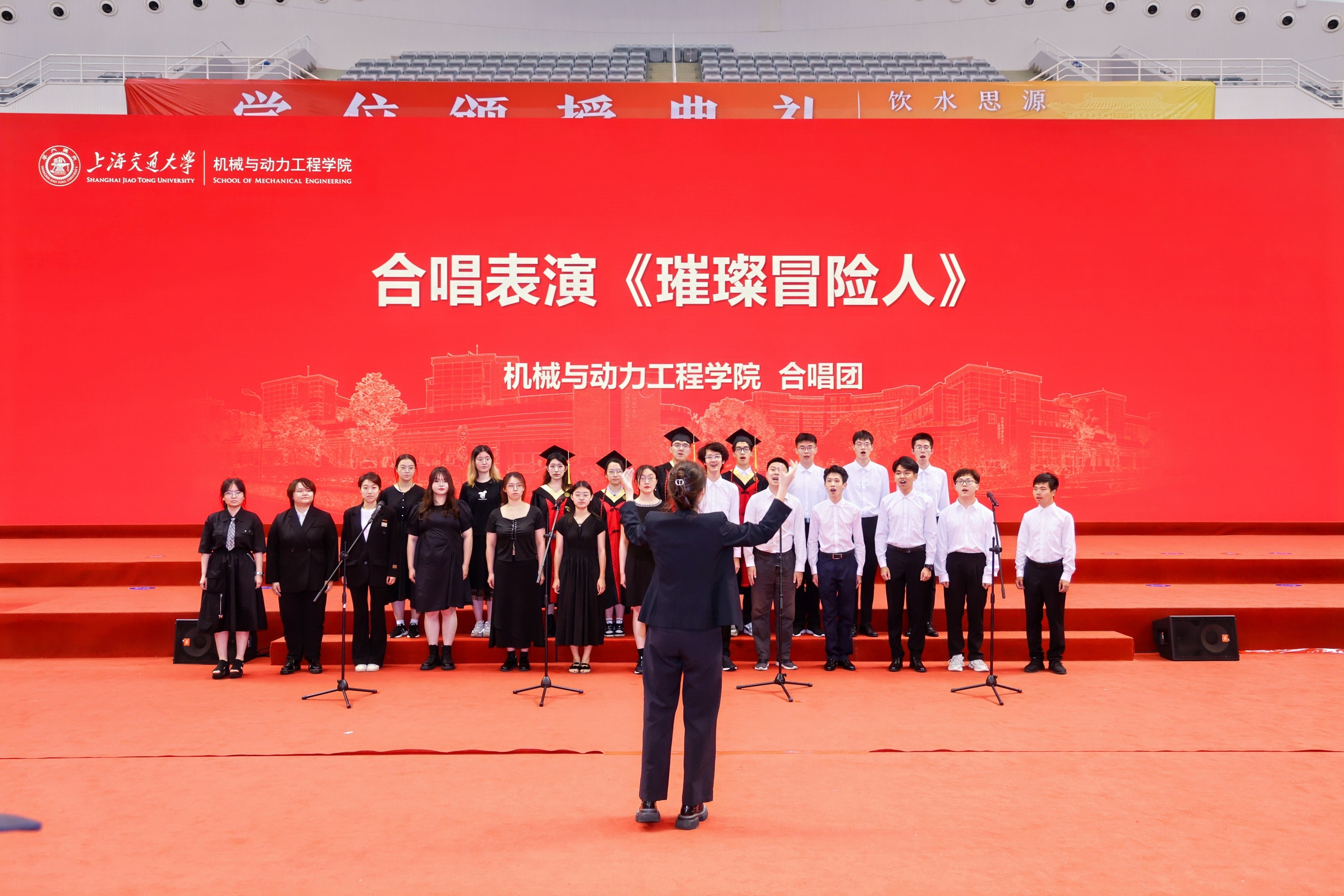 全体毕业生起立,许下铮铮誓言:“我将谨记饮水思源,爱国荣校之校训,恒德惟实,精勤不倦,强国兴业,砥砺前行,传机动精神,展交大气魄,以传承文明、探索真理为己任,为振兴中华,造福人类而奋斗终身!”学院合唱团带来《璀璨冒险人》歌曲,为毕业生送上祝福。
