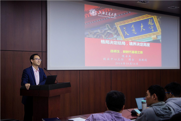 侯士兵以 “格局决定结局,境界决定高度”为主题向同学们作选调生政策解读专题报告。他从国际形势和国内政治体制改革讲起,建议同学们更多地思考其背后的深层原因,提醒同学们重视生涯规划;随后,侯士兵为同学们详细介绍了选调生政策的基本情况、报考流程和近年交大选调生的报考录取情况,重点强调了定向选调、公务员、大学生村官的区别;最后,他鼓励同学们走向祖国最需要人才的中西部地区,为国家和民族的发展做出交大人的贡献。在提问环节中,同学们踊跃参与,侯士兵对报考意向选择、专业限制等问题做出了详细的解答,同学们表示获益匪浅。