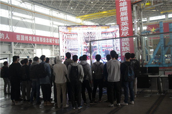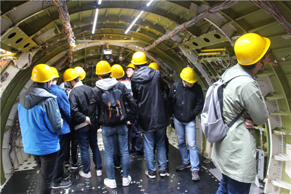 通过参观飞机机身强度检测的静力试验室,同学们了解了飞机全机身静力检测的基本原理、工作流程、技术难点以及过往经验,接待人员还带领同学们走进了一架装有检测仪器的裸机的内部,让同学们零距离亲身体验静力检测技术的精细与巧妙,面对着精巧设计的检测装置,同学们啧啧称奇。在愉悦的氛围中,参观师生结束了这趟科研参观旅程。