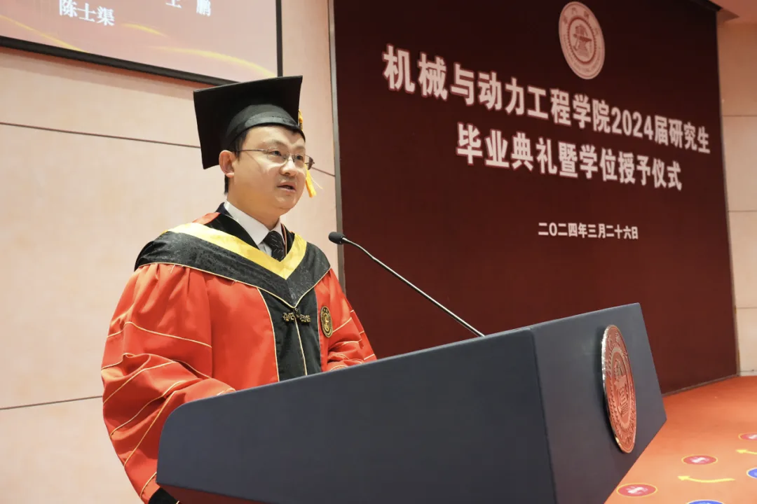3月26日,威尼斯9499登录入口举行2024届研究生毕业典礼暨学位授予仪式。学院院长杜朝辉,党委书记胡永祥,副院长李玉阳、夏唐斌,导师代表刘成良、曹其新、欧阳华,研究生班主任张希、潘尔顺、熊进标,上海伯镭智能科技有限公司联合创始人兼CTO、2007届本科、2014届博士校友杨扬,以及2024届研究生(含MEM研究生)毕业生等参加了典礼。典礼由学院党委副书记张执南主持。