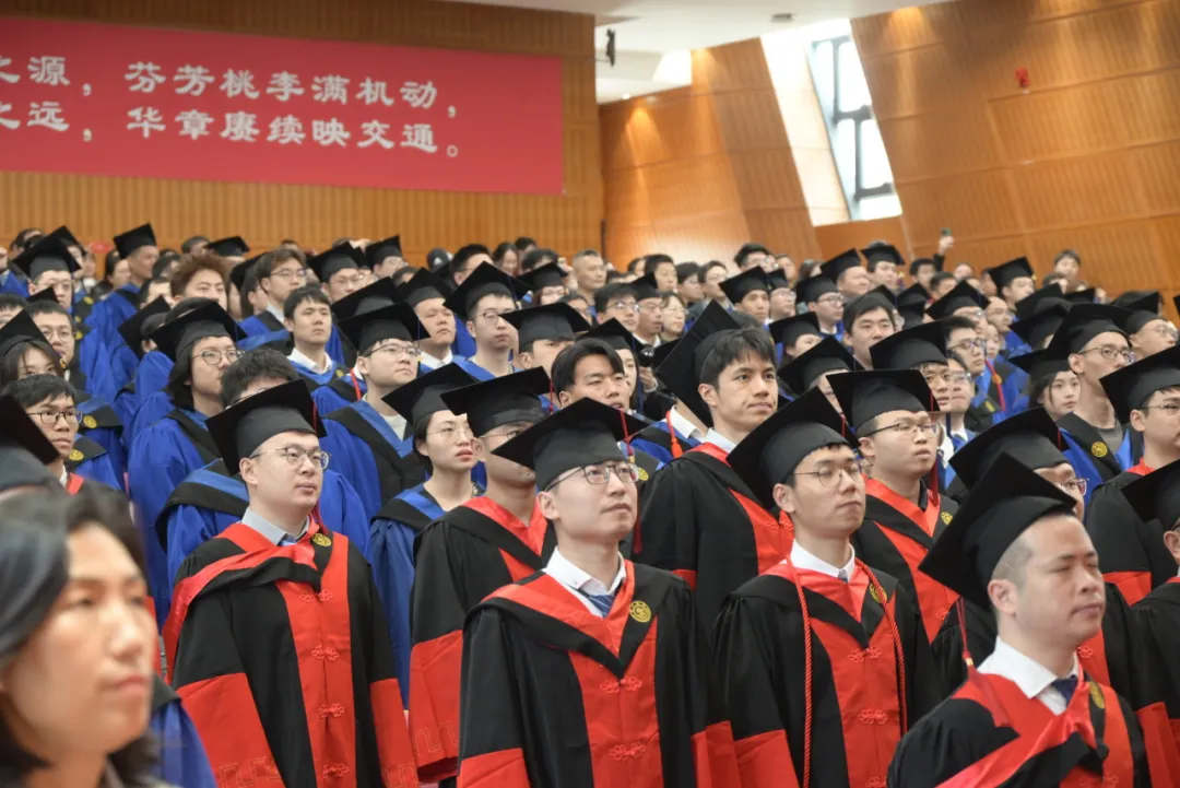 毕业生全体起立,许下铮铮誓言:“我将谨记‘饮水思源,爱国荣校’之校训,恒德惟实,精勤不倦,强国兴业,砥砺前行,传机动精神,展交大气魄,以传承文明、探求真理为己任,为振兴中华、造福人类而奋斗终身!”